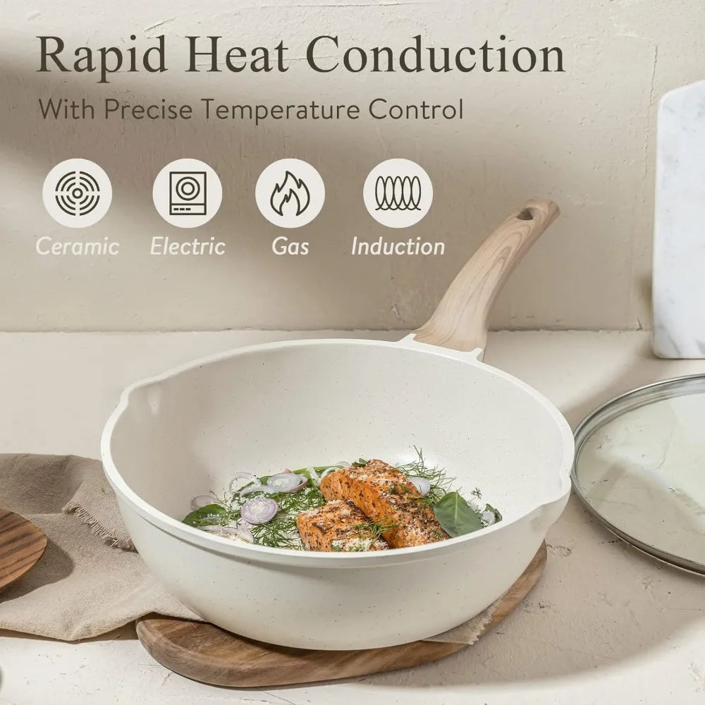 Invest in a cookware set that combines style, functionality, and health-conscious design. The white granite finish not only adds elegance to your kitchen but also ensures a non-toxic cooking surface free from PFOS and PFOA. With quick and even heating, this set reduces cooking time and energy consumption, making it an eco-friendly choice. Easy to clean and maintain, it’s perfect for busy households looking for convenience without compromising on quality.